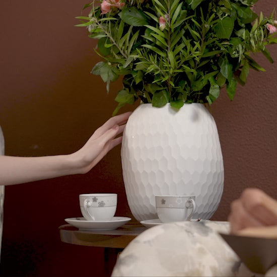 Linear Frost draws inspiration from the quiet symmetry of winter patterns — a handcrafted glass vase featuring a structured grid of carved lines and textures. Its soft matte white finish mirrors the look of frost delicately etched across a surface, creating a harmonious blend of geometry and grace.