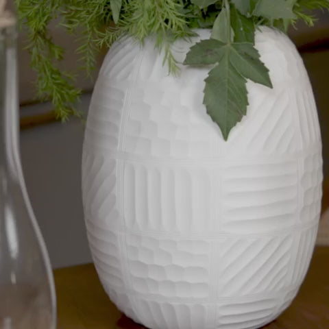 Meet Lume, where contemporary craftsmanship meets quiet sophistication. This white glass vase features a unique grid-carved texture that catches natural light beautifully, adding depth and dimension to your décor. Its clean oval form complements both floral arrangements and minimalist styling.