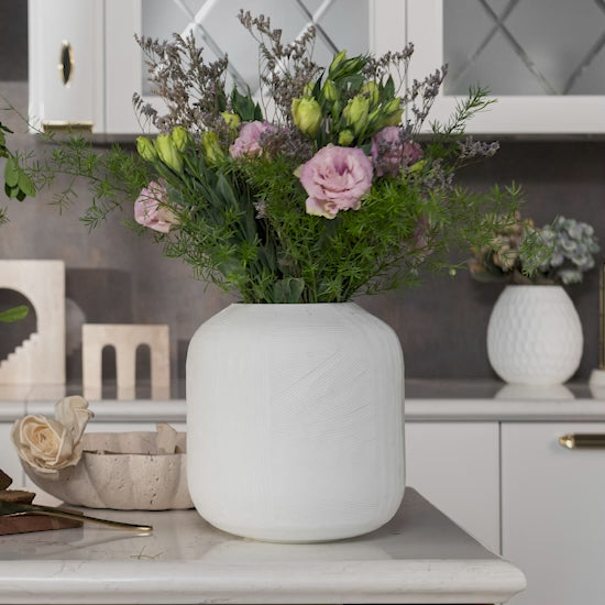 Ethereal and refined, the Luna Veil vase captures the quiet poetry of moonlight wrapped in delicate texture. Handcrafted from mouth-blown glass, its matte white surface is etched with soft linear patterns that resemble a gossamer veil drifting under a moonlit sky.